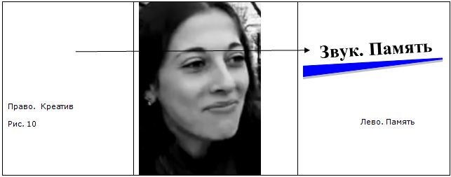 Ось перед нами людина. Ми з нею розмовляємо. Зліва від людини - область пам'яті, від умовної середньої лінії (рівня очей), до умовної верхньої лінії (рівень чола), частини обличчя. Праворуч від людини, область креативу (створення) образу, звуку, відчуття.