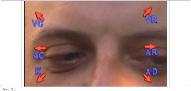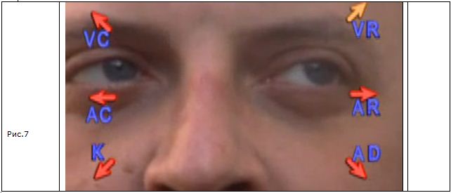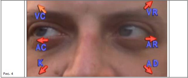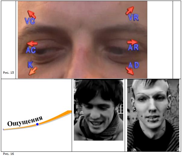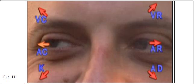 Область руху очей у верхній частині відноситься до візуального каналу. Тобто це: «образи», «картинки», «фільми», прокручувані людиною в пам'яті.