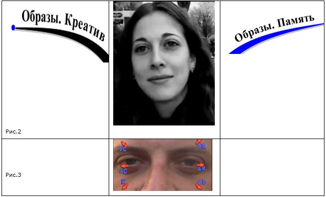 Що вийшло? Де очі? Вони метнулися праворуч вгору і повернулися назад. Все. Ці рухи продемонстрували - людина створила в голові образ, побачила його (помістила в тимчасову пам'ять). Якщо придивитися уважніше до первісного стрибку очей, то буде помітно невеликий рух вліво вгору, в область пам'яті. Спроба людини знайти у своєму досвіді (згадати) щось подібне. Подібний образ. І потім вгору, вправо. Це робота з образами.